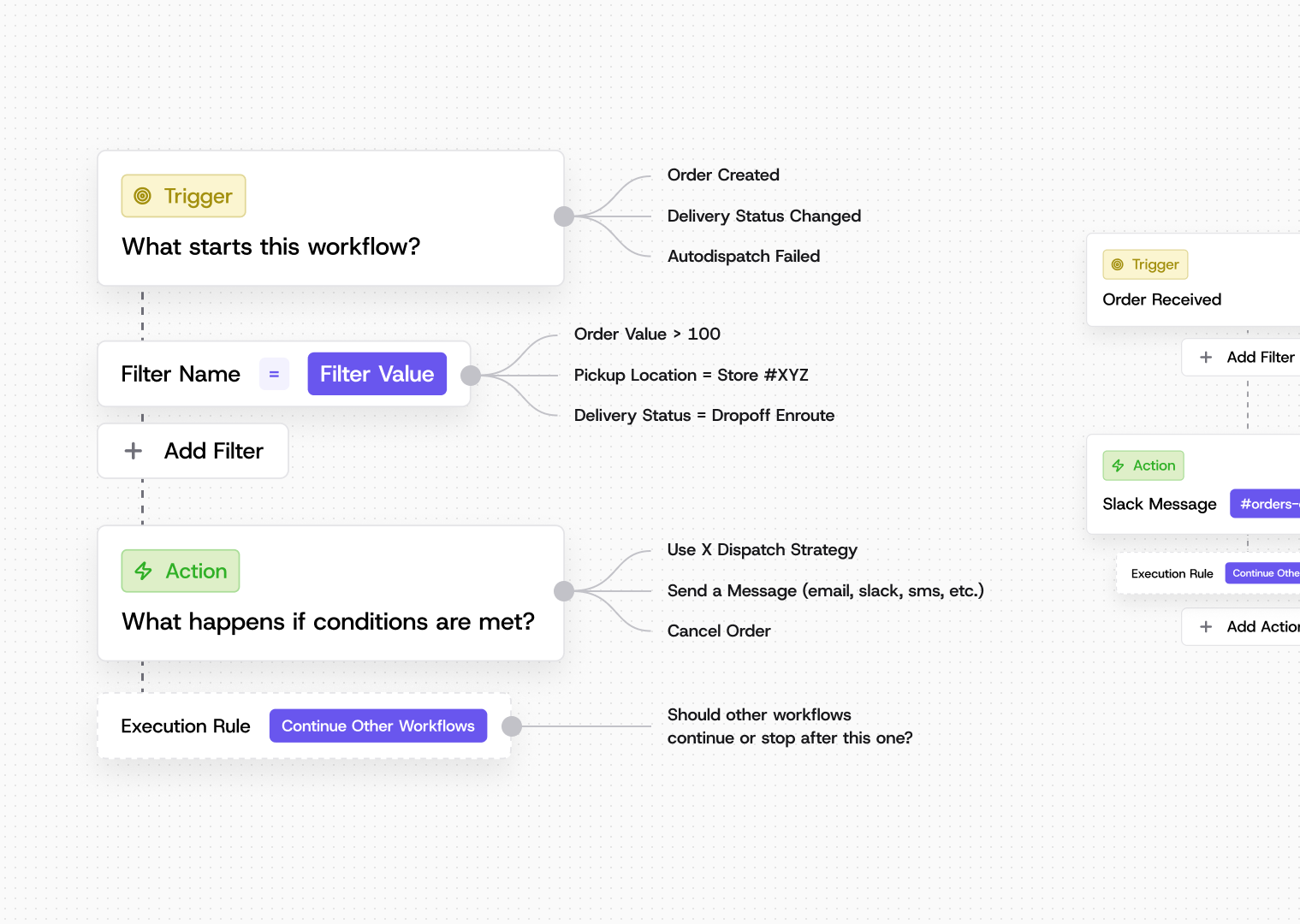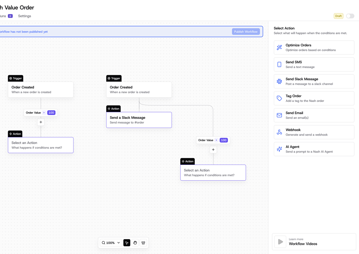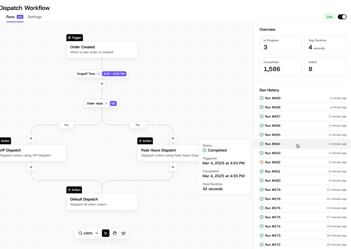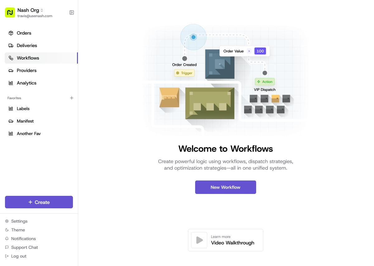 One of my major contributions was designing Workflows, a complete redesign of Nash’s automation system. I created a visual builder that allows merchants to orchestrate multi-step rules such as assigning orders, routing deliveries, and sending notifications based on real-time conditions. This unified experience replaced fragmented tools and gave businesses a clear, powerful way to automate their delivery operations without technical overhead.